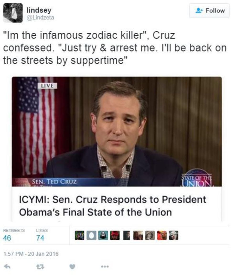 The mock conspiracy theory that Republican presidential candidate Ted Cruz was the Zodiac Killer, an unidentified serial killer who claimed to have killed 37 people in the late 1960s and early 1970s, grew in popularity in March of 2016. Considering that Cruz wasn't born until 1970, it is obvious that the memes are not based on truth, but the ridiculousness of this theory is the reason that it has been spread as quickly and consistently as it has. This Ted Cruz meme was only the start of many political jokes that peaked in popularity due to the 2016 presidential election.
