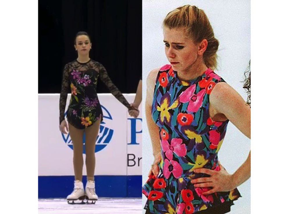6. This dress that didn't match the music but reminded you of Tonya Harding's homemade dress.