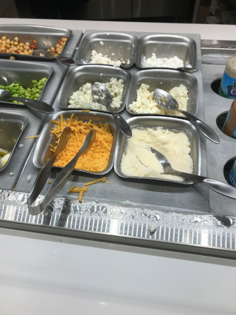 You never know what cheeses will be available to put your salad, but sometimes there are options like cottage cheese and the hard shaved parmesan. I prefer the shaved cheddar with my balsamic vinegar and oil, but blue cheese crumbles always being available makes it all OK.