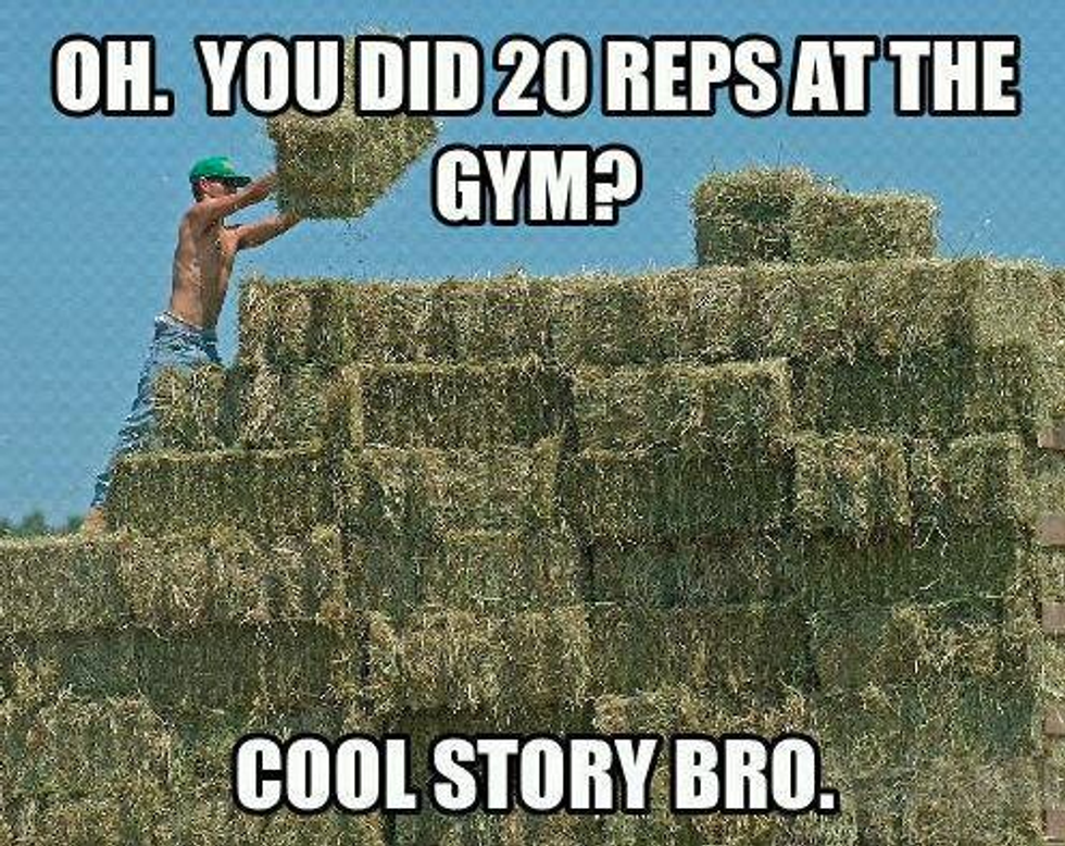 Nothing gives you a workout than stacking heavy square bales on a moving wagon. Let's not fail to mention that you also have to unload the wagon into the hay or straw mow, where the temperature is tipping above 105 degrees, and you are dressed in jeans, a t-shirt, and your hands are in gloves.