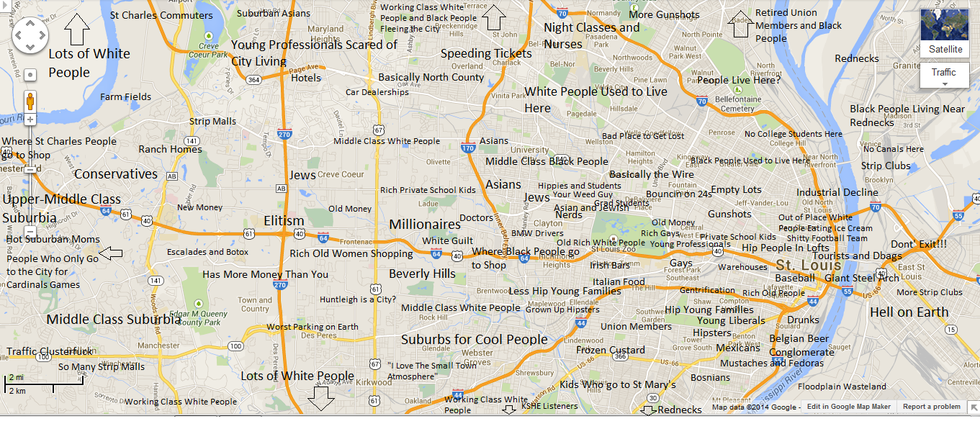 The city and county are divided into strict districts, each with unique and painfully true identifiers. Below is the Judgmental Map of St. Louis:
