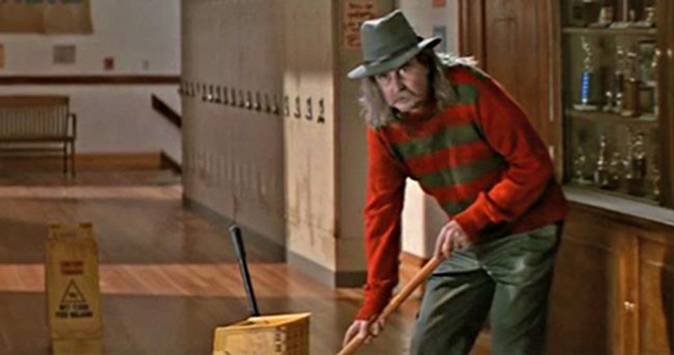 Wes Craven, the director of some of the greatest scary movies such as "The Hills Have Eyes", "A Nightmare on Elm Street", "Scream", and all their remakes, also made a few cameos in the scream films. In the original "Scream" he is known as janitor Fred and is dressed exactly like Freddy Krueger from "A Nightmare on Elm Street".
