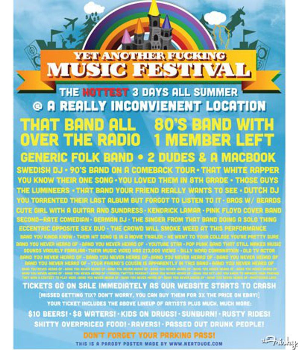 When half the bands you’re crazy about seeing have either disbanded or don’t tour anymore, finding the lineups for the thousands of festivals that happen these days is much less exciting. I do listen to some newer music but not enough to want to spend that kind of money on a pass for a festival where I’d likely only want to see one or two bands. I’d much rather save my money and buy a ticket for an individual concert or save up for a ticket to Jazz Fest where there are bands from every genre and just about every decade.