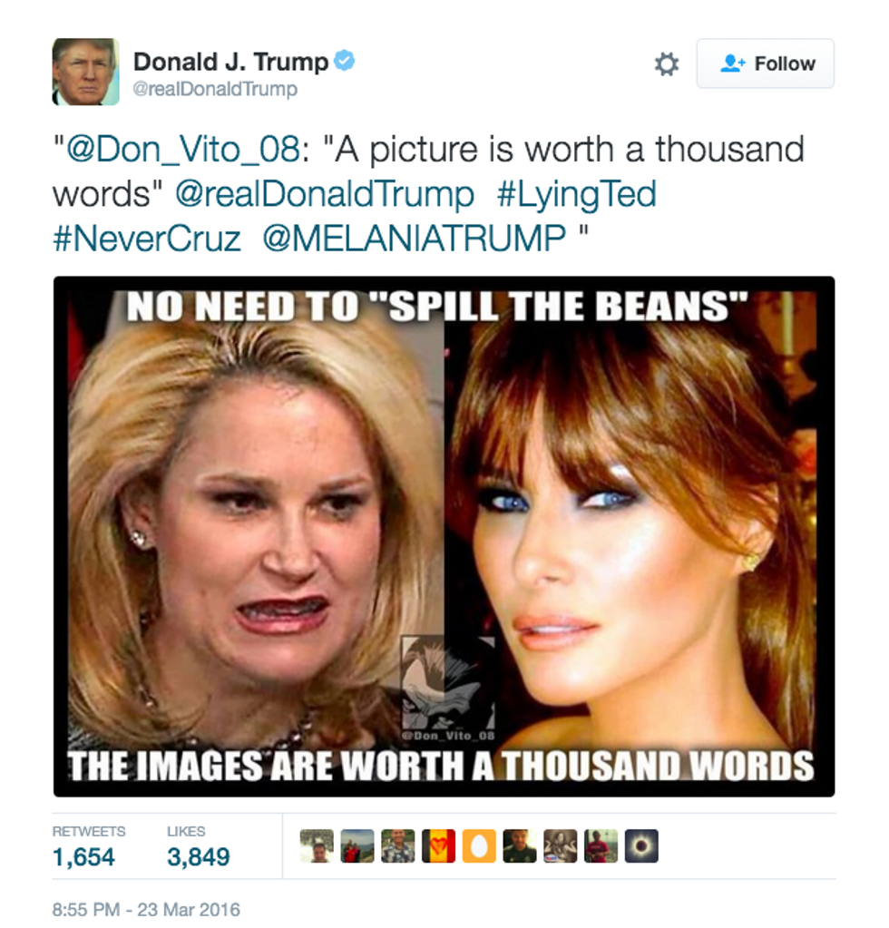 Attacking another mans wife for her appearances is uncalled for, even if it is your strongest opponent in a race. Keep the debates on the real issues that we are voting on and not on how hot your trophy wife is compared to another mans.
