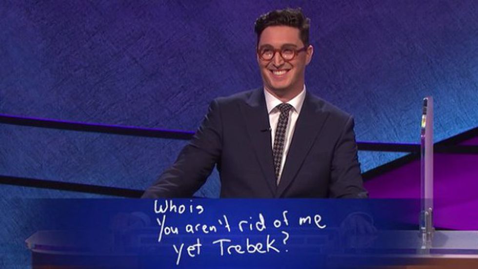 15. *You smile in glee when a contestant gets the better of Alex Trebek, like when the recent champ Buzzy Cohen was so far ahead in Final Jeopardy that it was impossible for him to lose. He saw an opportunity and he ceased it.*