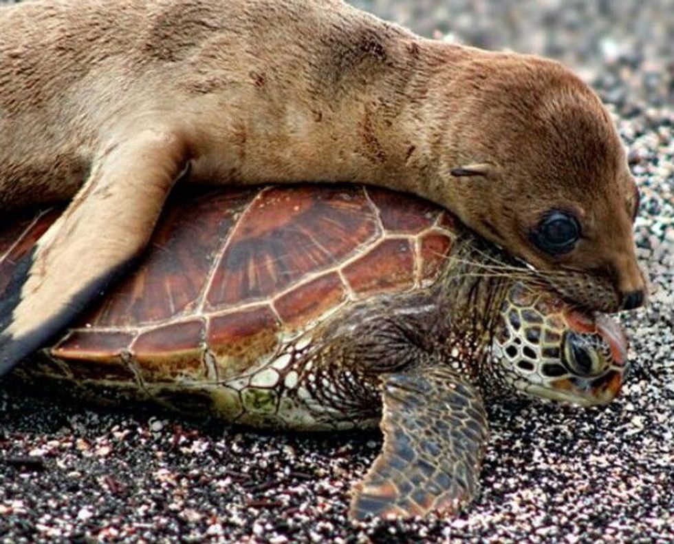 This little sea lion just wants to be loved, but this turtle is having none of it!