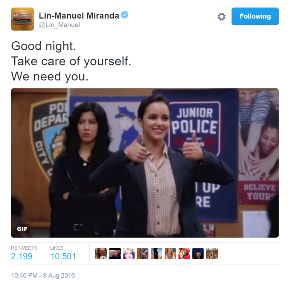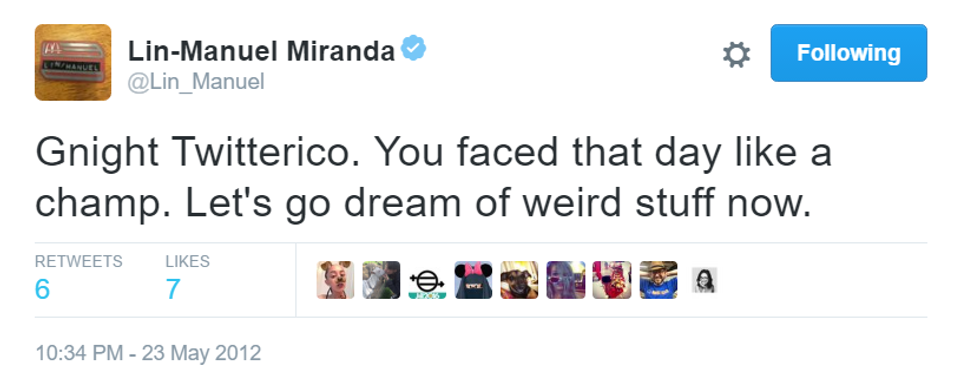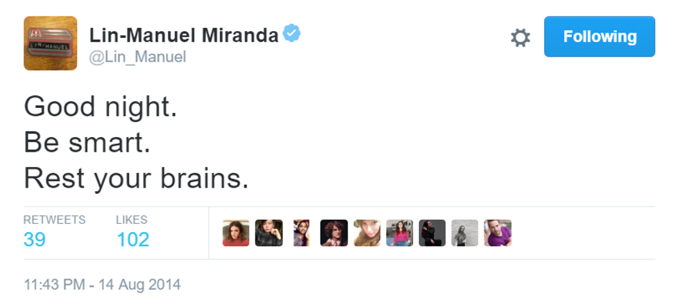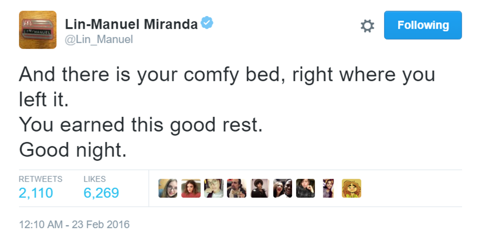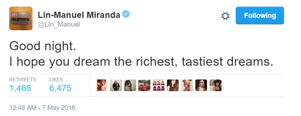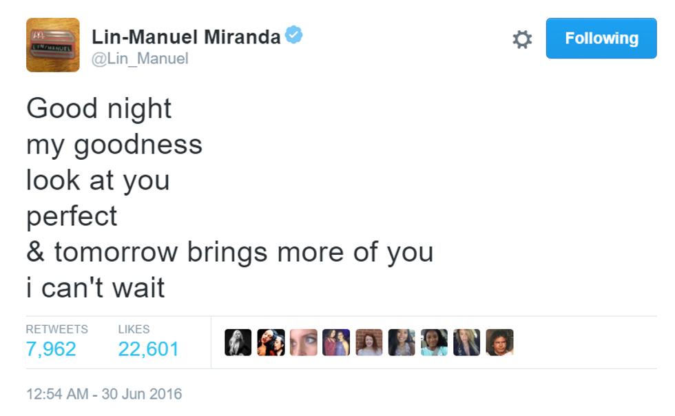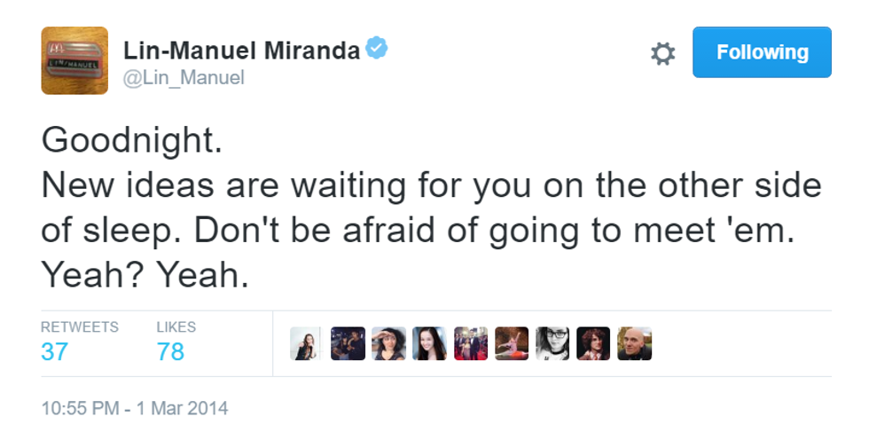 How can a man be so inspiring in only 140 characters? Here are the best of Lin-Manuel Miranda's goodnight tweets.