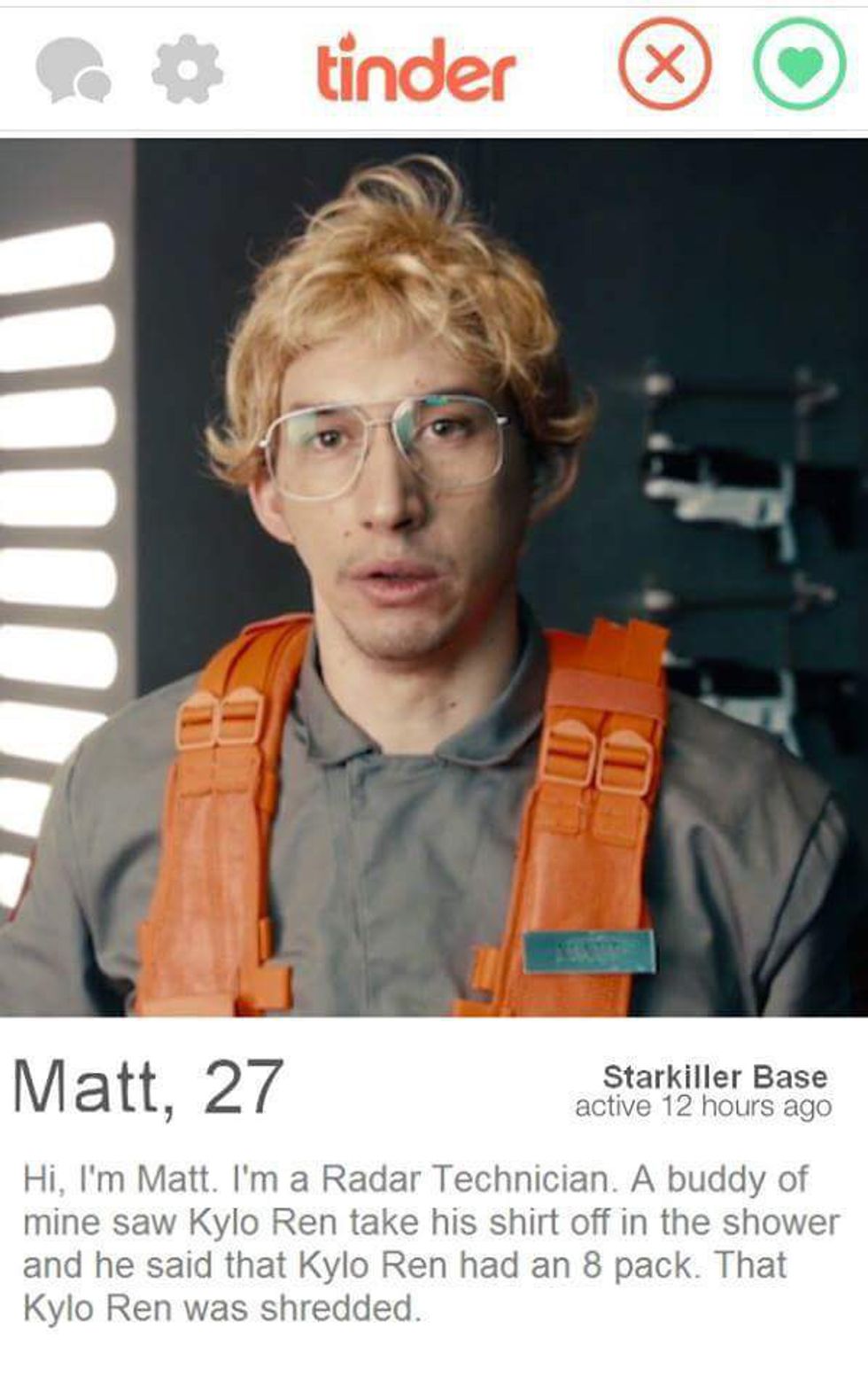 On Jan. 16, Star Wars actor Adam Driver hosted "Saturday Night Live." As the first SNL host of 2016 and coming off of the highest-grossing film ever, not to mention the fact that the episode premiered right after a widely watched NFL Playoff game, the pressure had to have been staggering for the 32 year old. Thankfully though, Adam Driver delivered a fantastic performance, even in the most unfunny of sketches, with the most notable sketch of the night requiring him to dawn his Kylo Ren costume once again for a genius Star Wars themed parody of ABC's "Undercover Boss." Of course it was to be expected that the best of the sketches in the audience's opinion would be the big Star Wars parody, but what no one expected was for the imminent rise to fame of Kylo Ren's alias, Matt the Radar Technician. Within the span of two days, Matt the Technician became a trending topic on Tumblr, his sketch has already reached almost 9 million views on YouTube, and someone has even gone as far as creating an official Matt the Radar Technician Action Figure. So what is it about this average technician that has taken over the hearts of Star Wars fans everywhere? Well, for most people, its the fact that inside all of us is an awkward Star Killer Base radar technician. Sometimes we can see Matt in us in just our every day lives. Here are only a few examples of how we ALL carry the spirit and complexity of our lord and savior, Matt the Radar Technician.