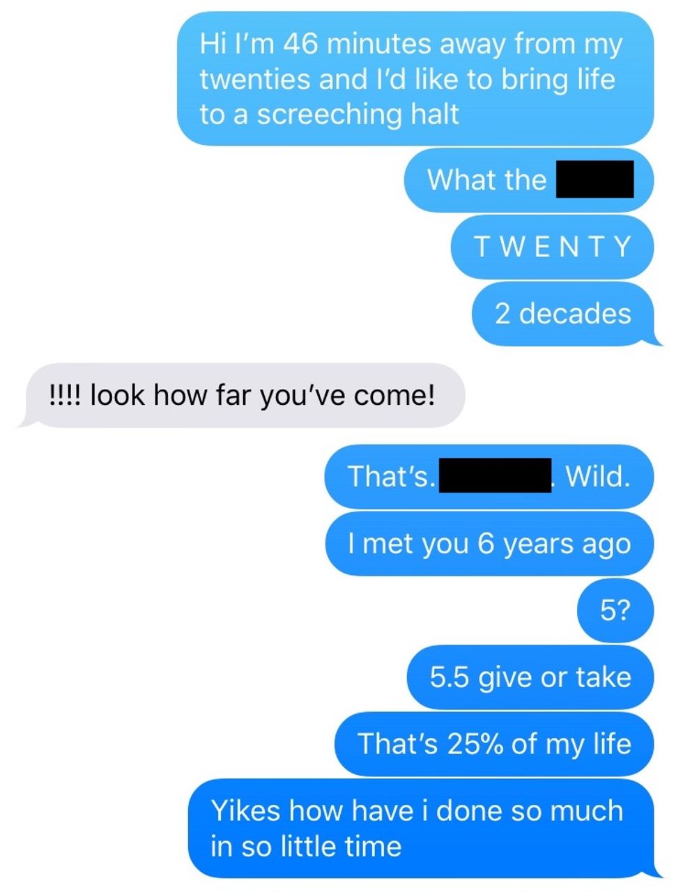 I had a little bit of a breakdown when I left my teens behind. It's wild to think that I'm now in my 'twenties.' It's the beginning of a new era, and leaving the old one behind was a little scary. My phone was blowing up with messages from my closest friends and even people that I wasn't close to. They sent funny pictures, dog GIFs, personal stories, and notes of encouragement. The feelings of love were immeasurable.