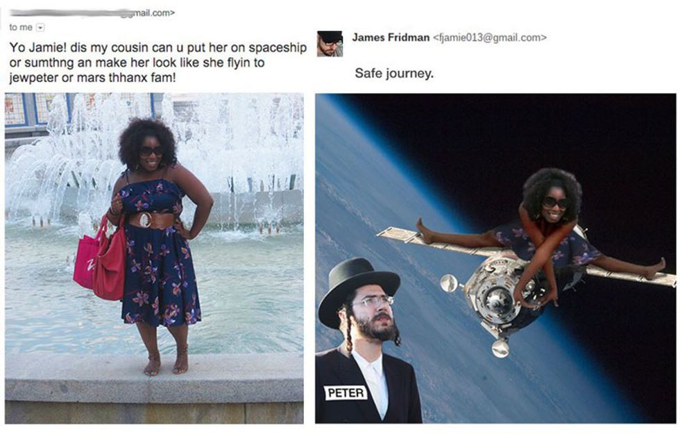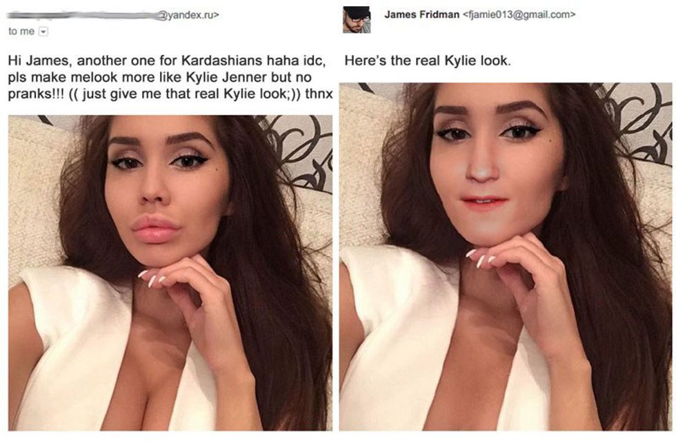 Meet James Fridman, a graphic designer and a Photoshop king who will take your images and make the photo edits you request. However, the photo he sends back will not likely be the Instagram-worthy image expected. Instead, Fridman manipulates the public's pictures, often literally and sarcastically, based on their unrealistic requests.
