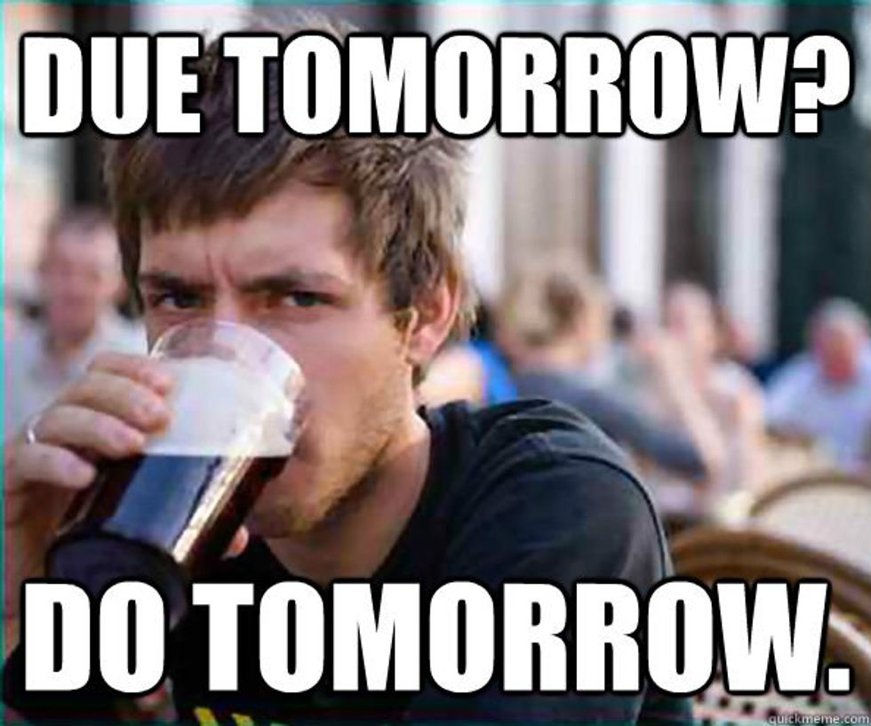Let's face it-- we all have something we like to put off to the last minute. Whether it be homework, studying, papers, you name it, we all procrastinate on something. Some of us have a tendency to procrastinate more than others, at times on purpose and other times we do it unconsciously. We like to find as many excuses as possible to push off work until it absolutely has to be done. Here are just a few that any procrastinator may say: