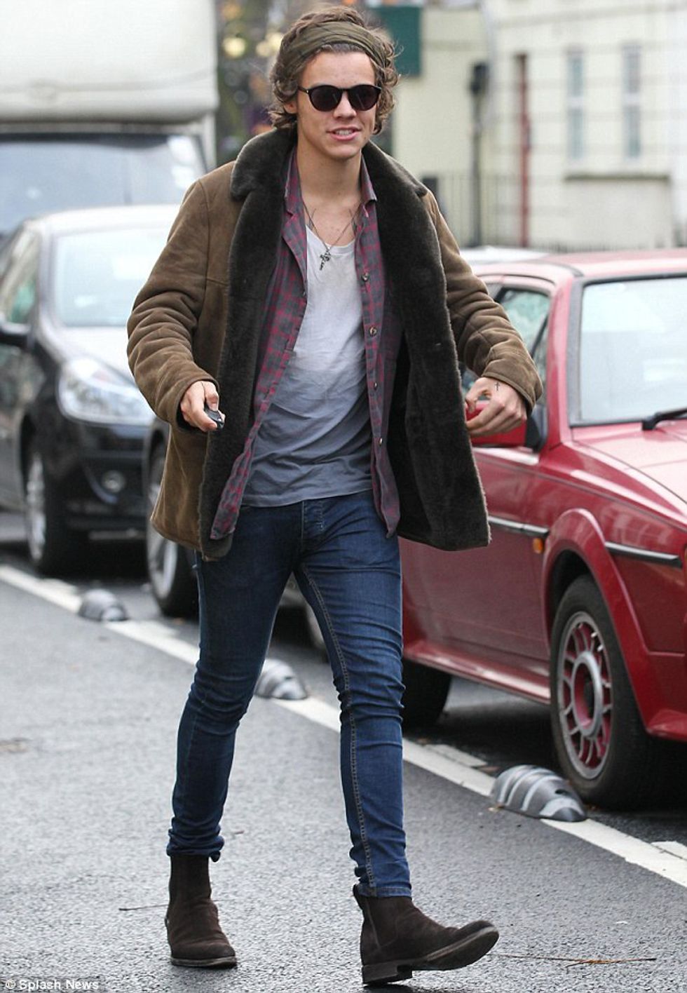 Even though, Styles was just going out for coffee, his outfit was still one that stands out. A printed shirt of pink feathers, skinny jeans with a hole and suede boots, Styles was staying true to himself.