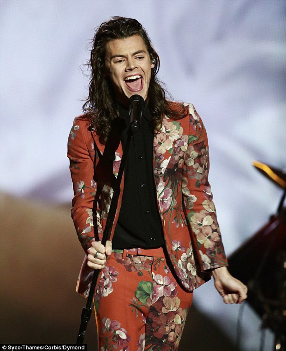 The band appeared on the finale of the X Factor UK, and Styles wore a full floral suit from Gucci. This was one of his best outfits yet.