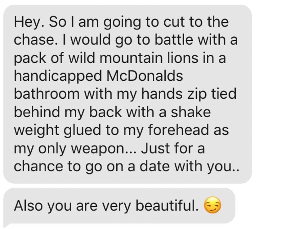 This guy probably has this lil’ story typed up, saved, and ready to copy and paste it to anyone he messages, so don’t feel special. Can we just talk about how the heck he came up with that story? 8.5/10 for creativity.