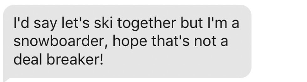 This applies if you have anything ski/snowboard related on your profile… and yeah it’s a deal breaker. Haha, he thought.