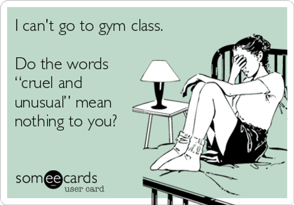 If you went to a school that required physical education, you may know that gym class is quite possibly one of the worst things ever. Next to calculus, waking up early, and people that talk really loudly in the movie theater of course. And if you were one of those athletic kids that really excelled in gym, well good for you, you're probably in better health than me. Unless you were the try hard that acted like gym was the Olympics. No one likes a try hard. Here are some reasons why I'm still just a little bitter about high school gym and why I'm hoping there's some way for me to get my future kids out of it.