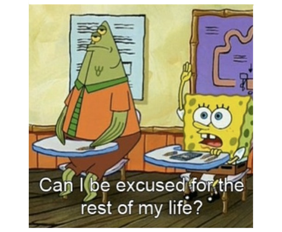 2.)When you've had 3 tests, 2 quizzes, 6 homework assignments, and 2 papers in one week and it's finally the weekend
