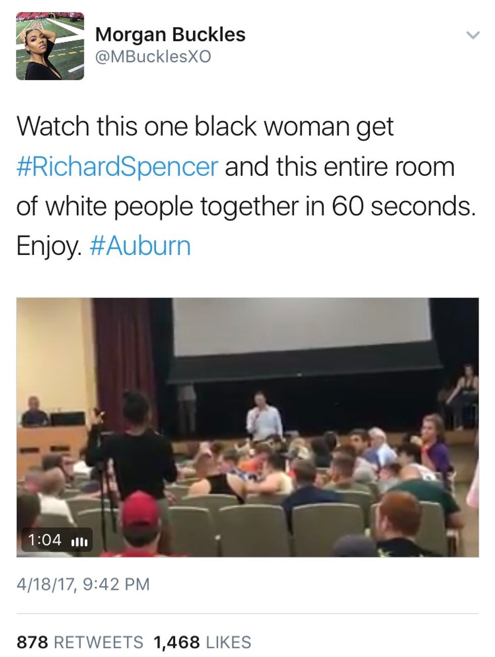 Watch this one black woman get #RichardSpencer and this entire room of white people together in 60 seconds. Enjoy. #Auburn pic.twitter.com/8loTWO42FD