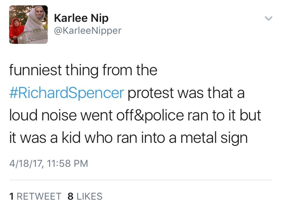 funniest thing from the #RichardSpencer protest was that a loud noise went off&police ran to it but it was a kid who ran into a metal sign