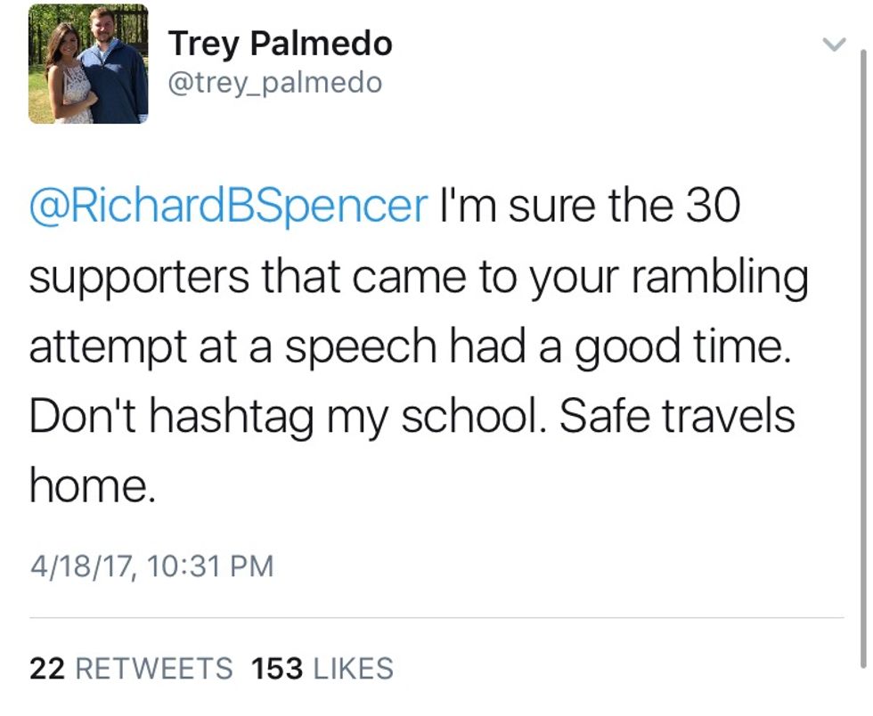 @RichardBSpencer I'm sure the 30 supporters that came to your rambling attempt at a speech had a good time. Don't hashtag my school. Safe travels home.