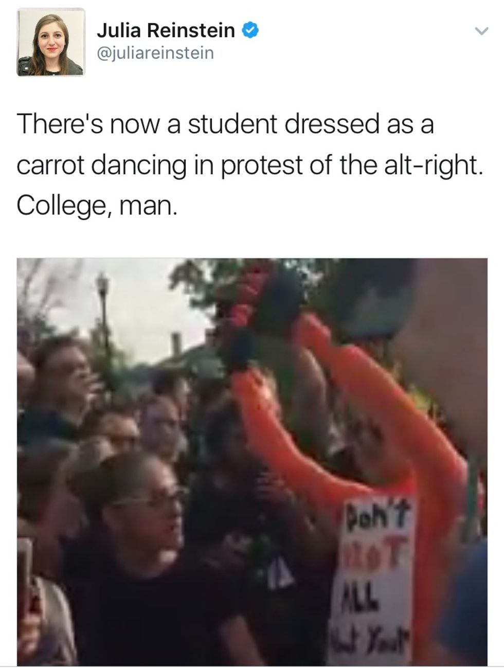 There's now a student dressed as a carrot dancing in protest of the alt-right. College, man. pic.twitter.com/HvxaEWwmal
