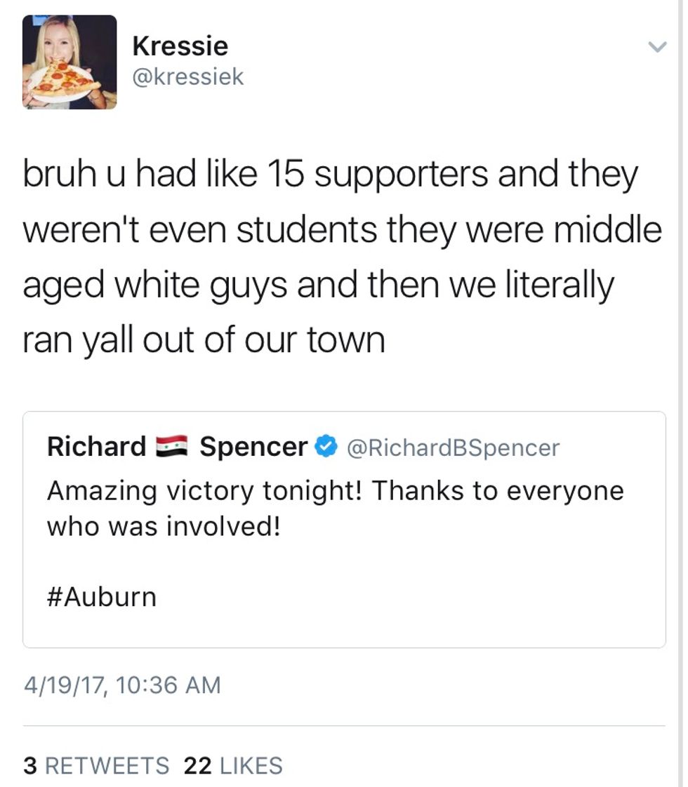 White supremacist and alt-right leader Richard Spencer came to Auburn University on Tuesday, April 18, expecting a crowd of supporters. Instead, he got a crowd of students showing him that racism was not welcome on Auburn's campus through a series of hilarious, heart-wrenching and empowering tweets. Here are some of the highlights.