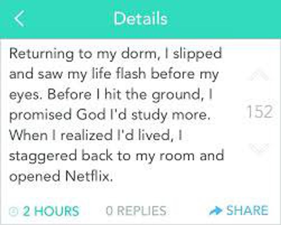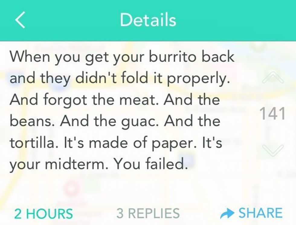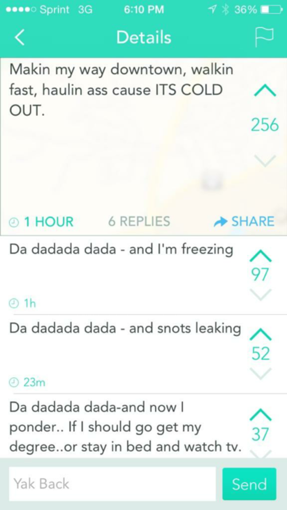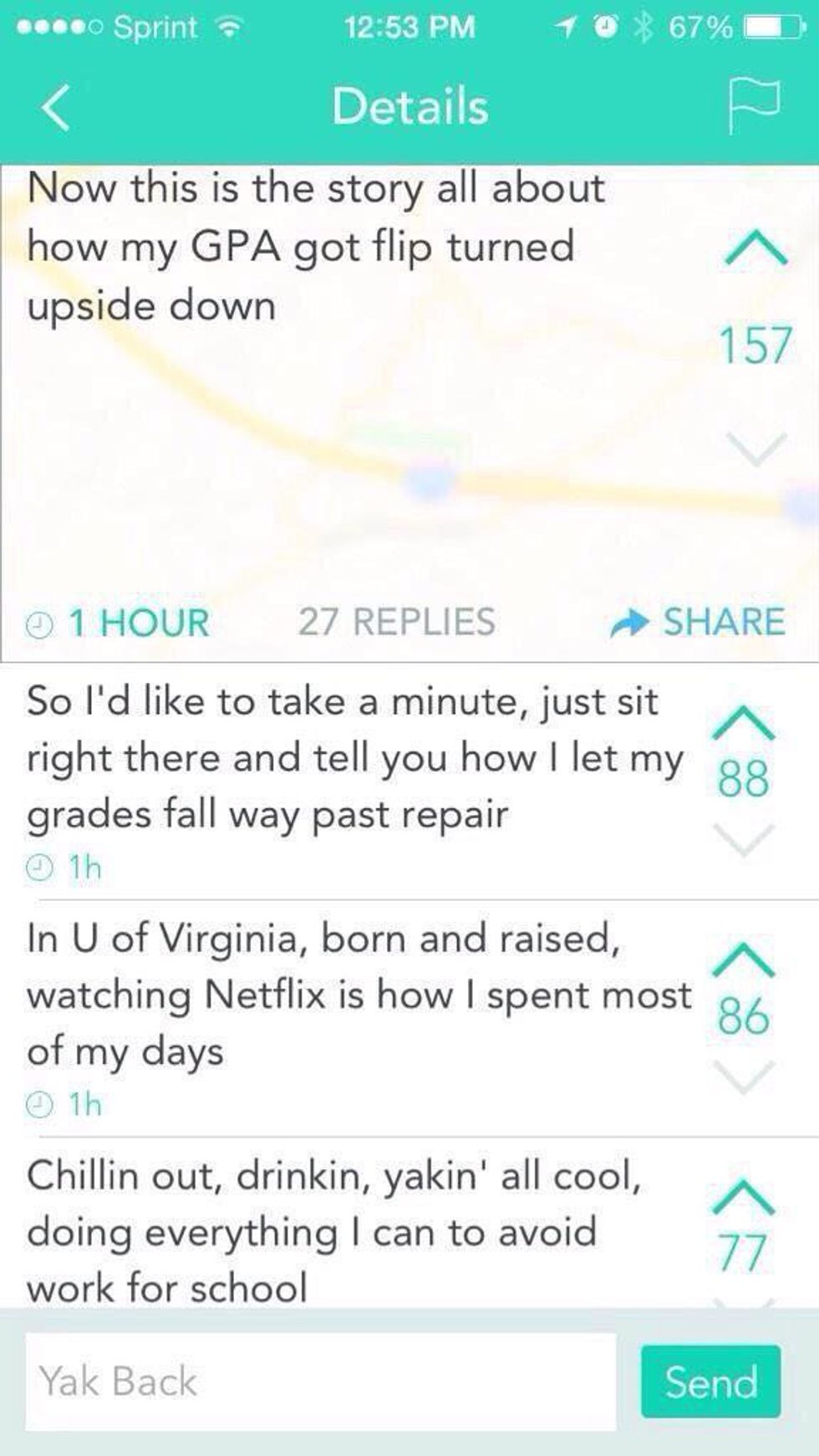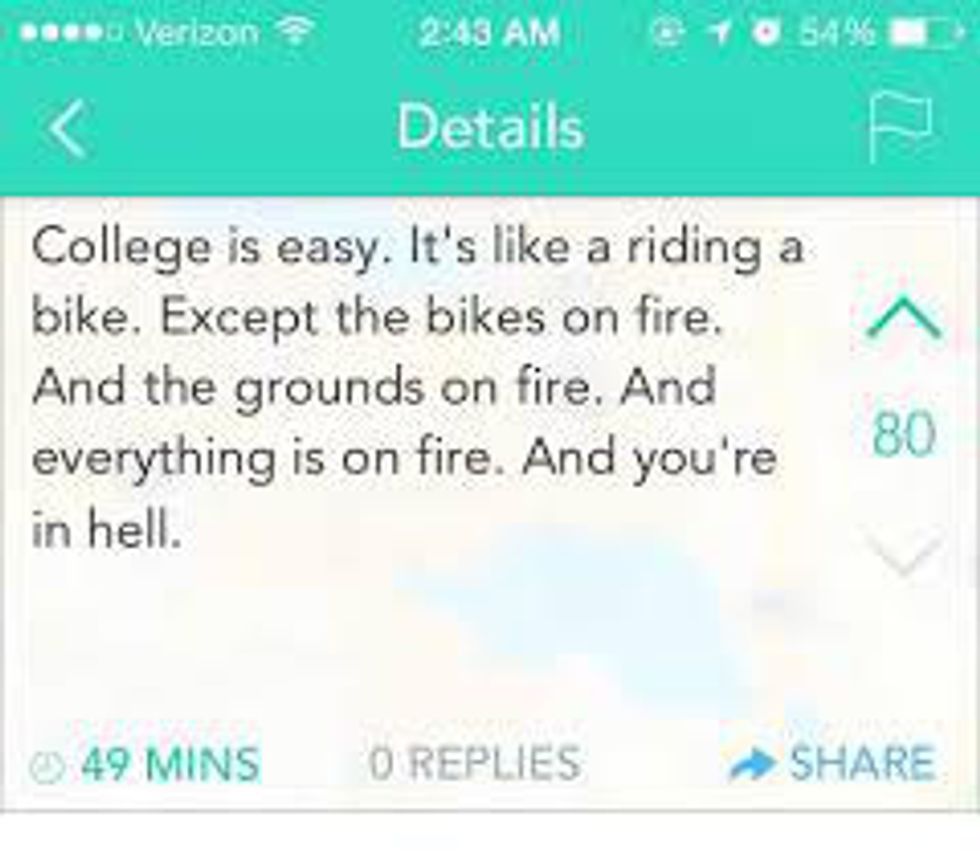 Yik Yak is an app that is gaining popularity on campuses everywhere. Users can post anonymously, and it's usually something hilarious. Here's just a few Yik Yaks that any college student can relate to.