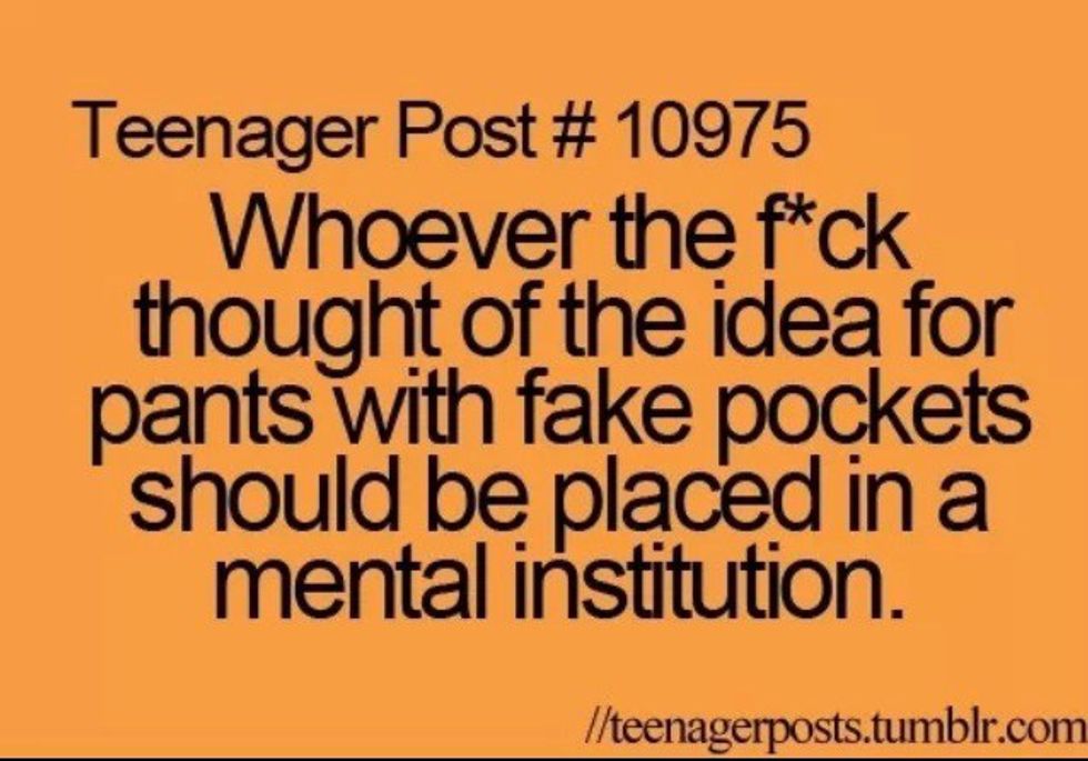 Why sew an illusion on my pants just to piss me off!? I can't wrap my head around it and it makes me unhappy. Where do I put my phone now, or money? My bra? No. Because that's already exceeding capacity with the fruit assortment strapped to my chest.