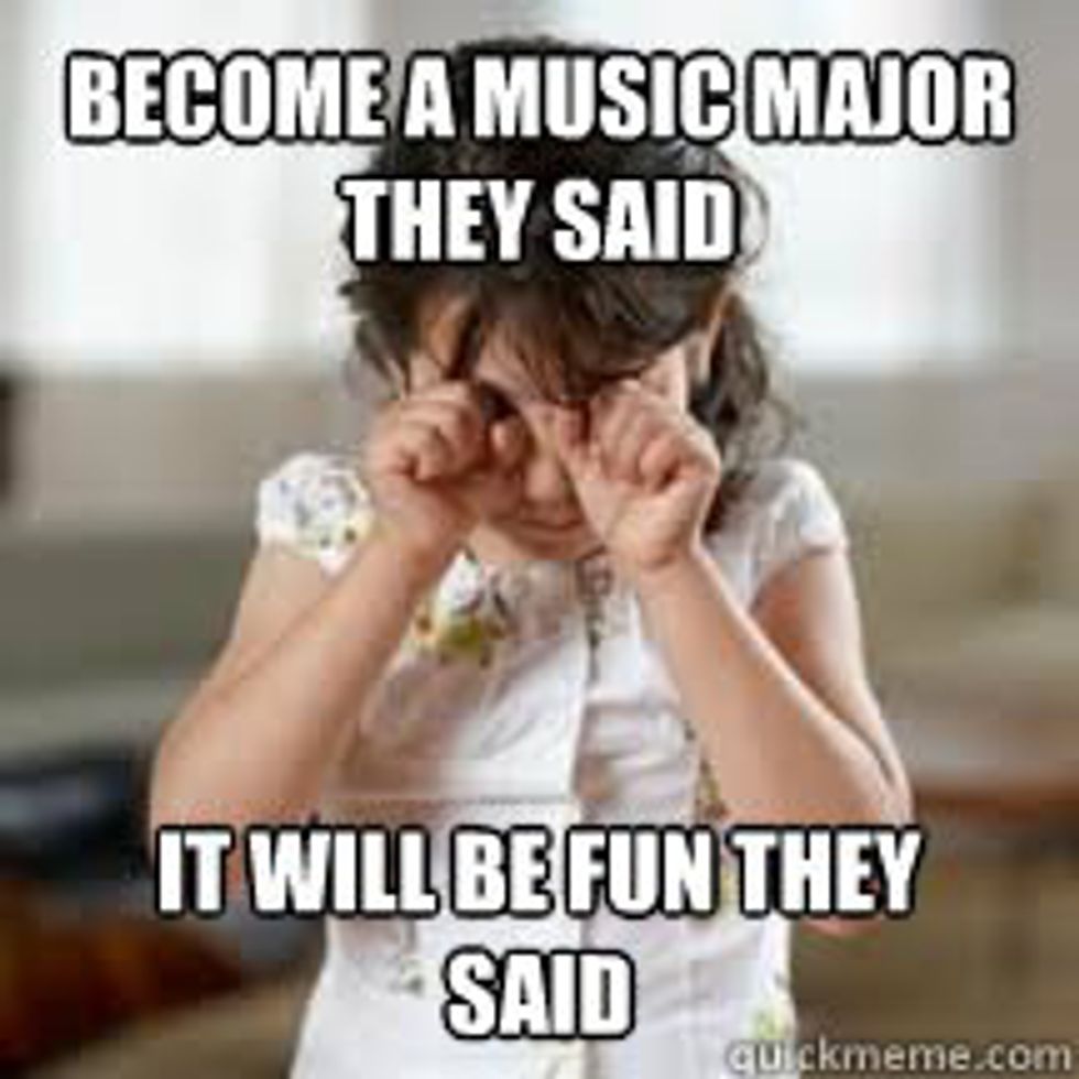 College me: Why am I here for 12 hours a day? I hate myself for choosing music. I'm not ready for my lesson! Did I practice piano today? Who cares it, won't sound good anyway. Let's be real, I'll probably end up flipping burgers for the rest of my life and have to sell my clarinet in order to eat.