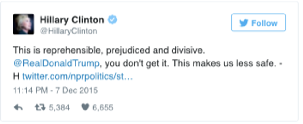 Islam is a religion that consists of people from all over the world, people of all races. In fact, there are white American Muslims living among us today. So, it is primitive to constrain a religion to a certain region, race of people and the acts of those that practice Islam. Trump is not the only candidate to (bluntly) express his Islamophobic views. When his statement was released, Hillary responded by telling Trump he doesn’t “get it” and that his proposal will only make us “less safe." It is easy to miss that the other half of this tweet is Islamophobic. She is suggesting that the ban of Muslims will awaken the "angry" gene that only the descendants of Ishmael inherited.