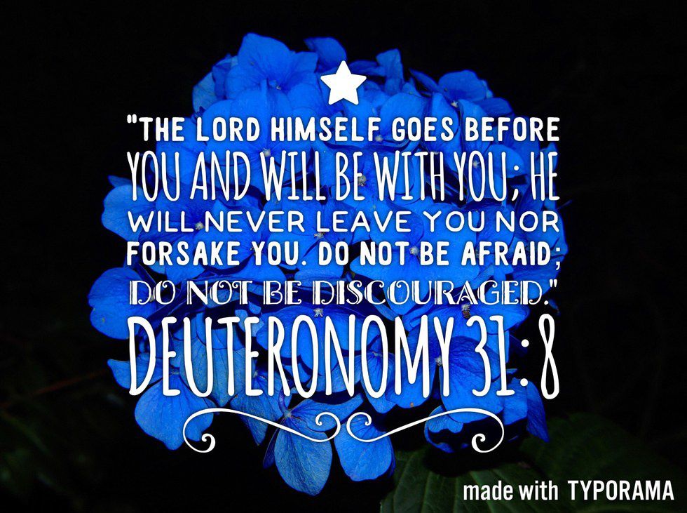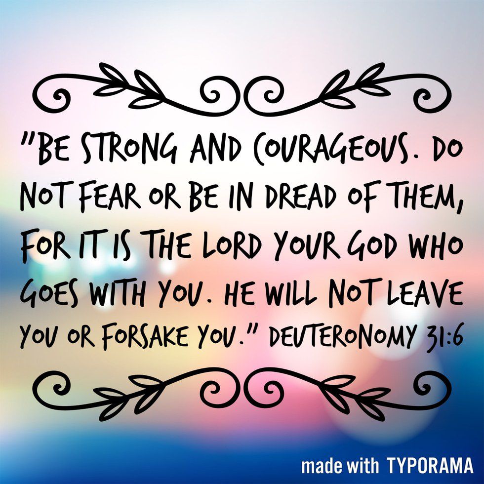 7. “Be strong and courageous. Do not fear or be in dread of them, for it is the LORD your God who goes with you. He will not leave you or forsake you.” Deuteronomy 31:6 (ESV)
