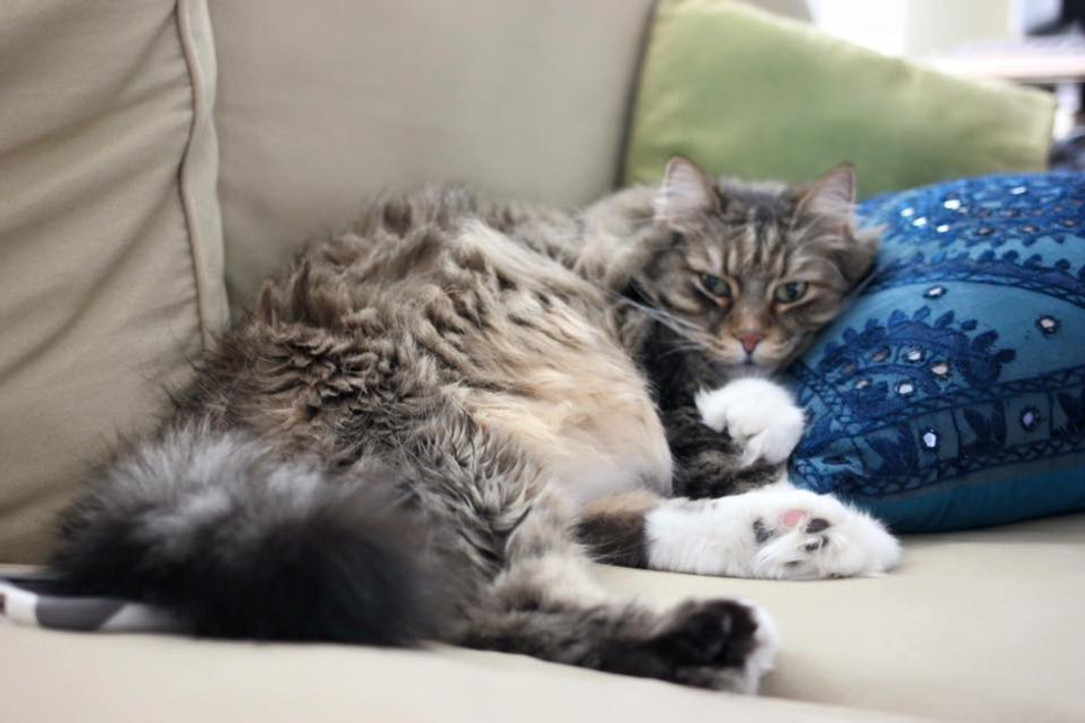 I have two cats named Mitterz and Squeaks. I adopted Mitterz as a kitten about thirteen years ago and I adopted Squeaks, who's about three years old, this past fall. I love them both to death! My favorite thing to do with them is cuddle with them in my bed in the morning.