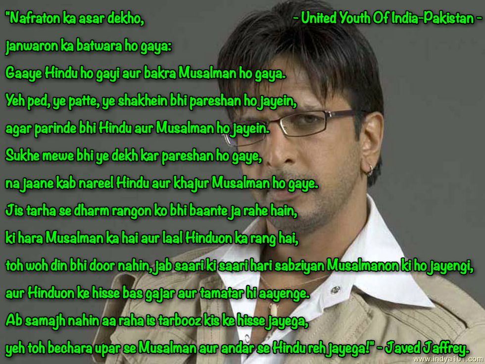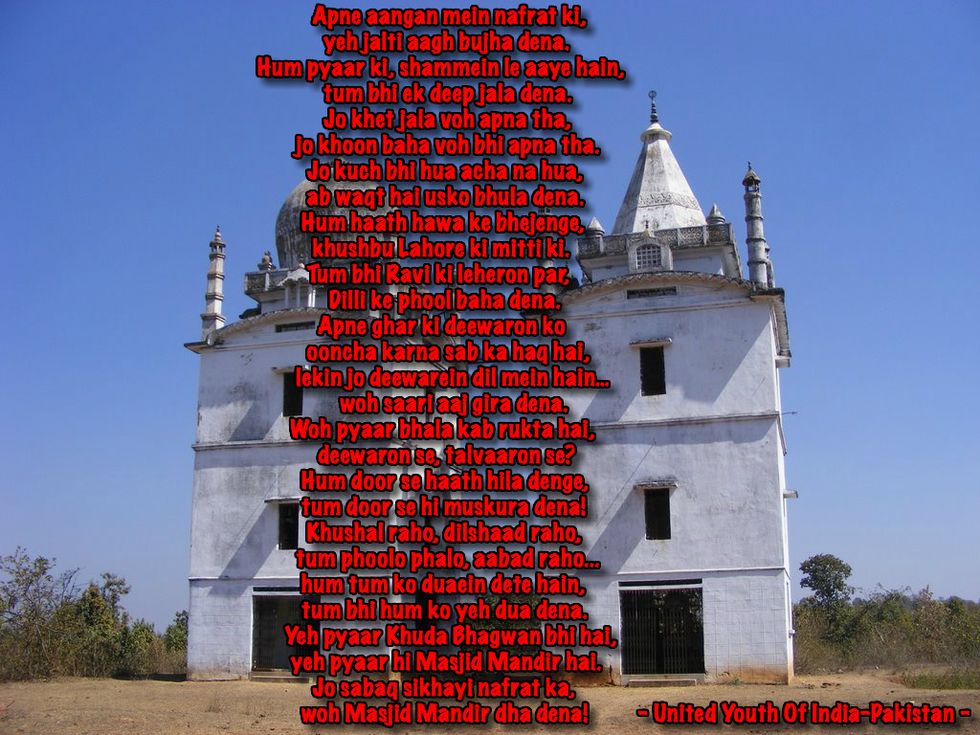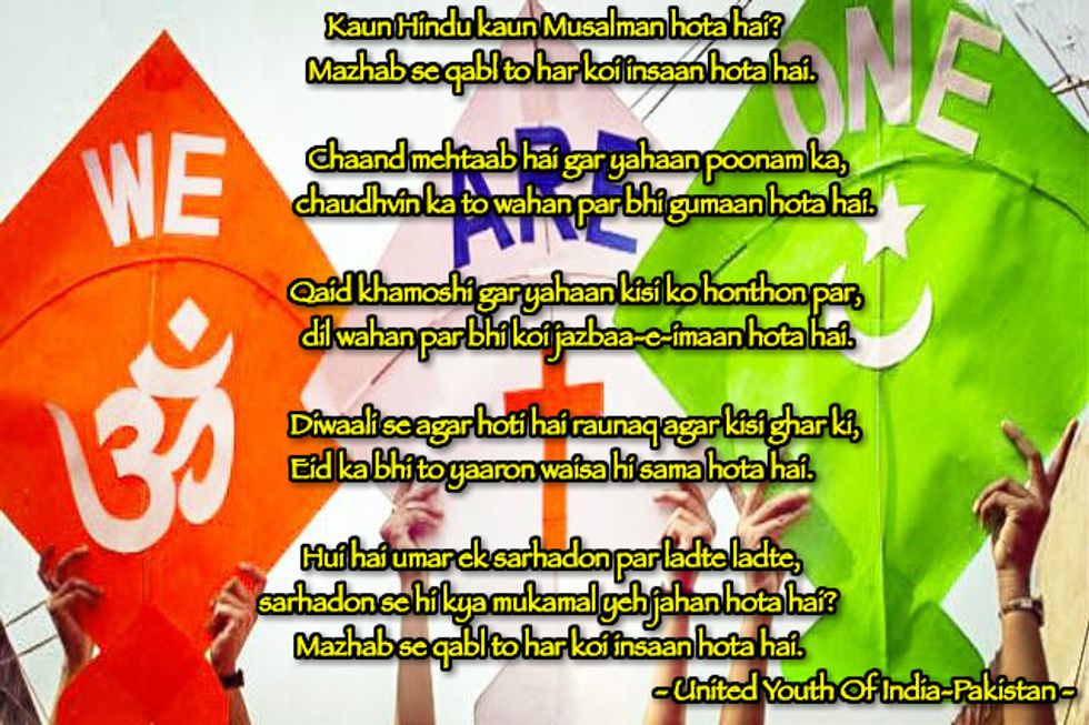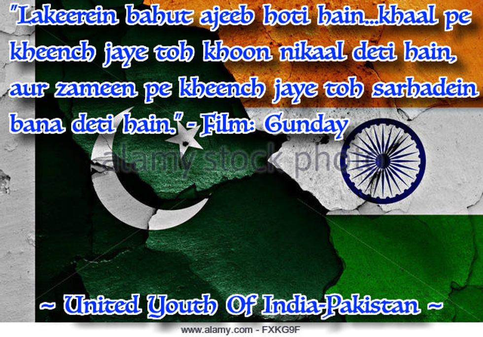 "For centuries, saints and scholars have bonded the Hindus and Muslims together. But these leaders divided our brotherhood. In the same house, they have hung two different things. One is India, the other is Pakistan. We do fight. The walls are created there. But a brother doesn’t become the enemy of another brother. We are all different, but the roots of our relationship are on this side of the wall, and on that side as well. There is not even enough weight in this wall of hatred to break our relations. When the Berlin wall was able to come down, the what meaning does this wall have? Sir, now the citizens themselves want to meet. The citizens themselves want to meet!”