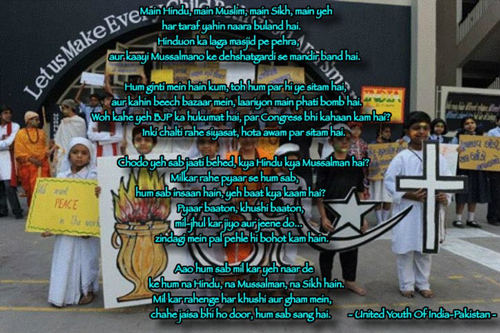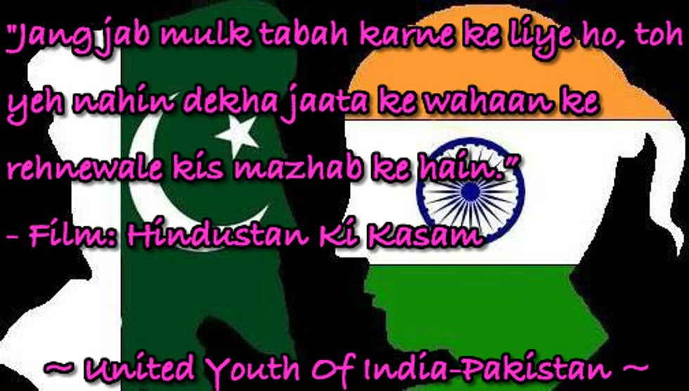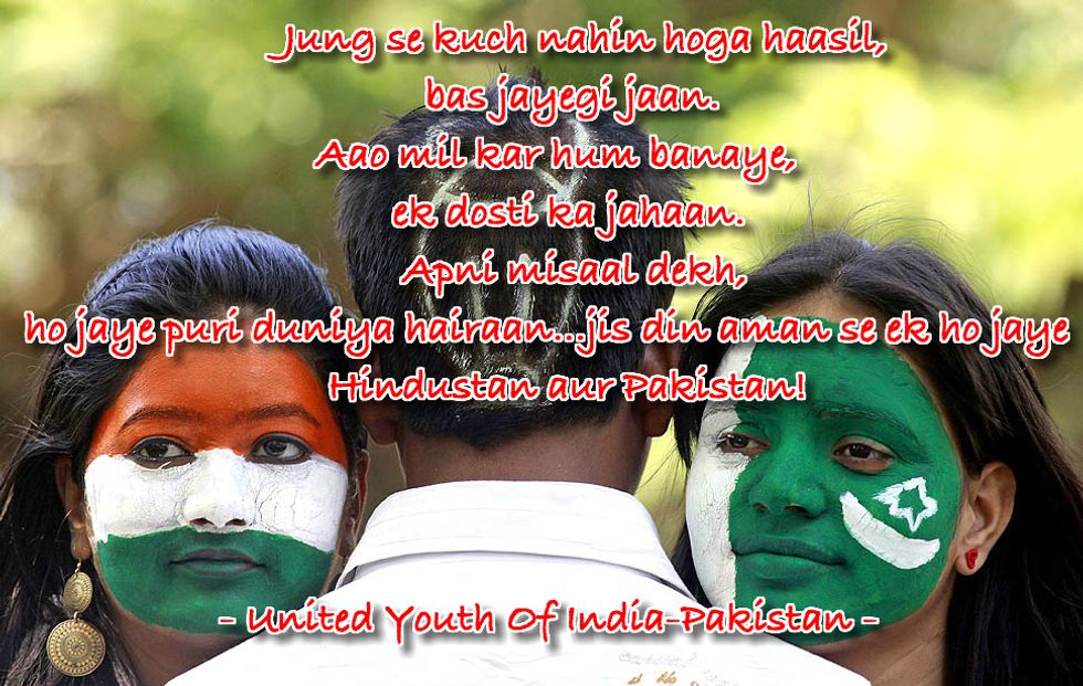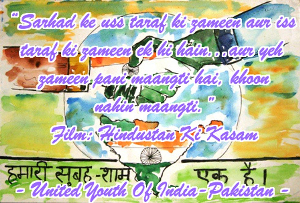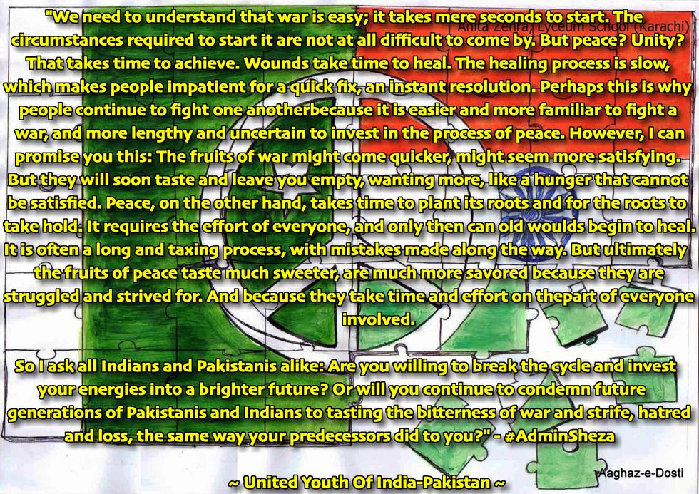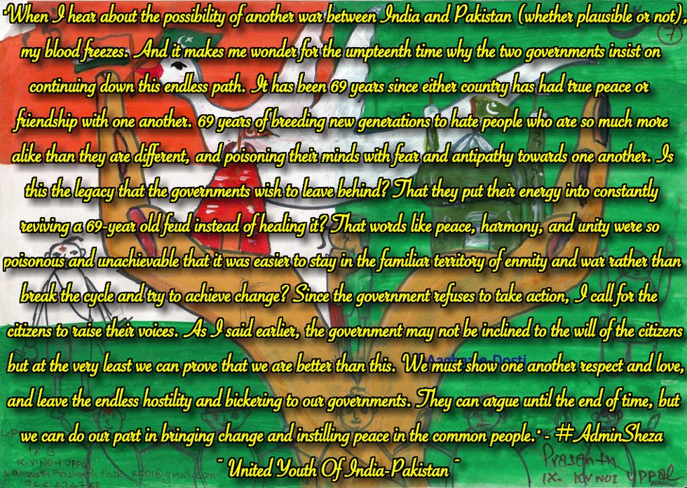 "When I hear about the possibility of another war between India and Pakistan (whether plausible or not), my blood freezes. And it makes me wonder for the umpteenth time why the two governments insist on continuing down this endless path. It has been 69 years since either country has had true peace or friendship with one another. 69 years of breeding new generations to hate people who are so much more alike than they are different, and poisoning their minds with fear and antipathy towards one another. Is this the legacy that the governments wish to leave behind? That they put their energy into constantly reviving a 69-year old feud instead of healing it? That words like peace, harmony, and unity were so poisonous and unachievable that it was easier to stay in the familiar territory of enmity and war rather than break the cycle and try to achieve change? Since the government refuses to take action, I call for the citizens to taise their voices. As I said earlier, the government may not be inclined to the will of the citizens but at the very least we can prove that we are better than this. We must show one another respect and love, and leave the endless hostility and bickering to our governments. They can argue until the end of time, but we can do our part in bringing change and instilling peace in the common people."