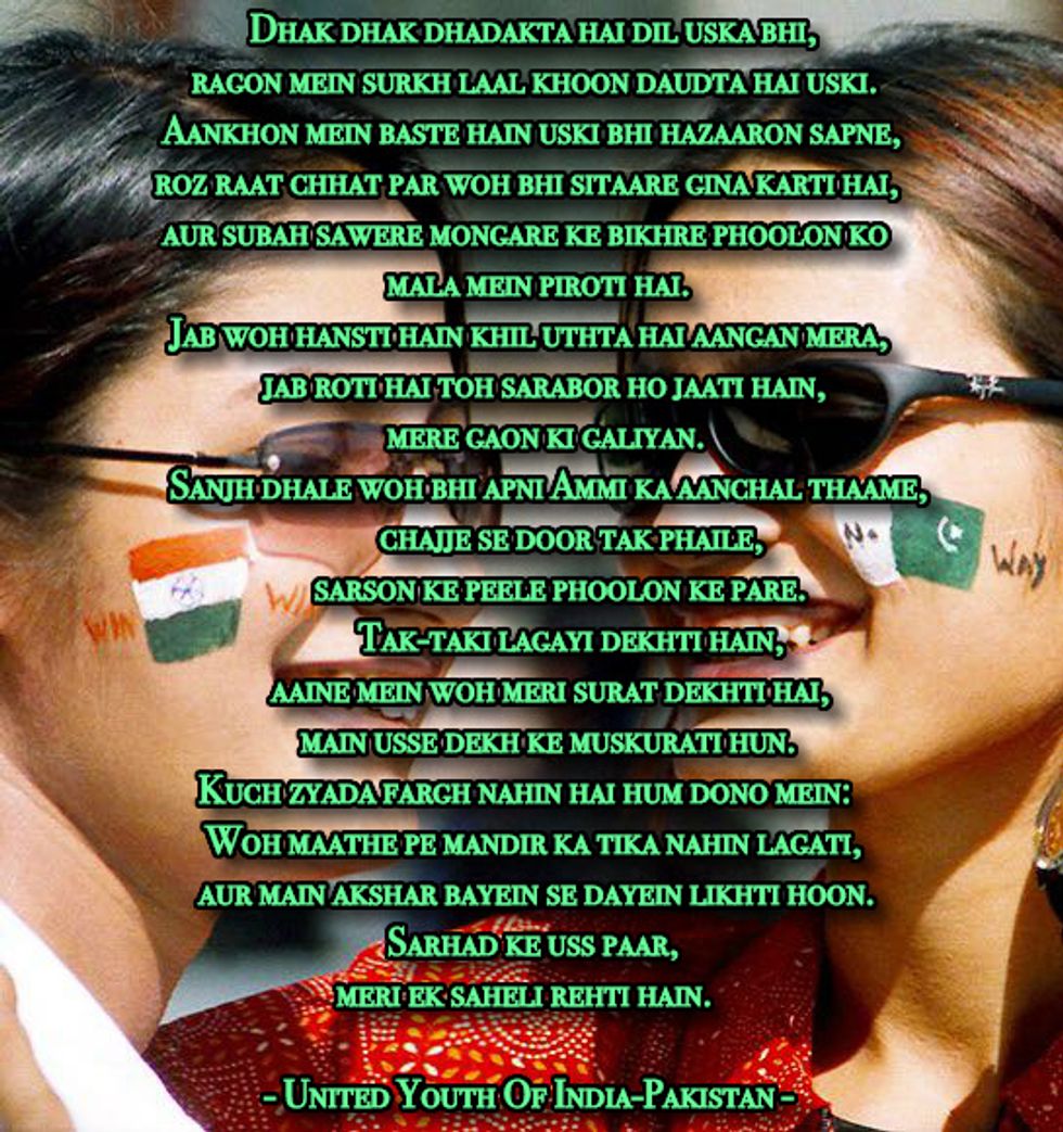 “Hum dono lakeer ke aar paar zaroor khade hain, magar hamara mulk ek hai, hamara khoon ek hai, aur woh aurat bhi ek hai, jis ke kokh se hum dono ne janam liya.”