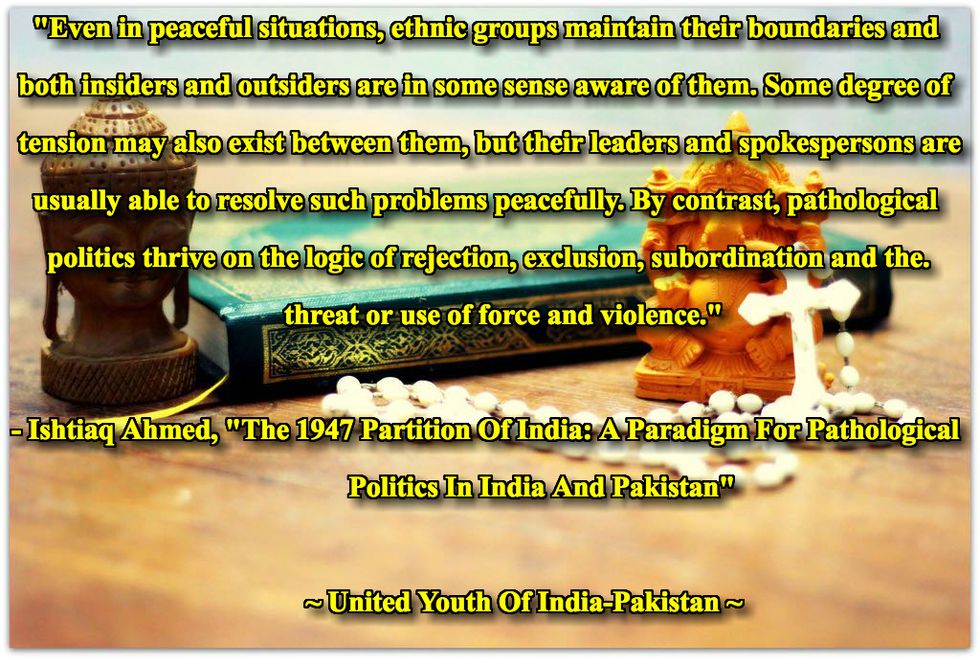 “Even in peaceful situations, ethnic groups maintain their boundaries and both insiders and outsiders are in some sense aware of them. Some degree of tension may also exist between them, but their leaders and spokespersons are usually able to resolve such problems peacefully. By contrast, pathological politics thrive on the logic of rejection, exclusion, subordination and the threat or use of force and violence. ”