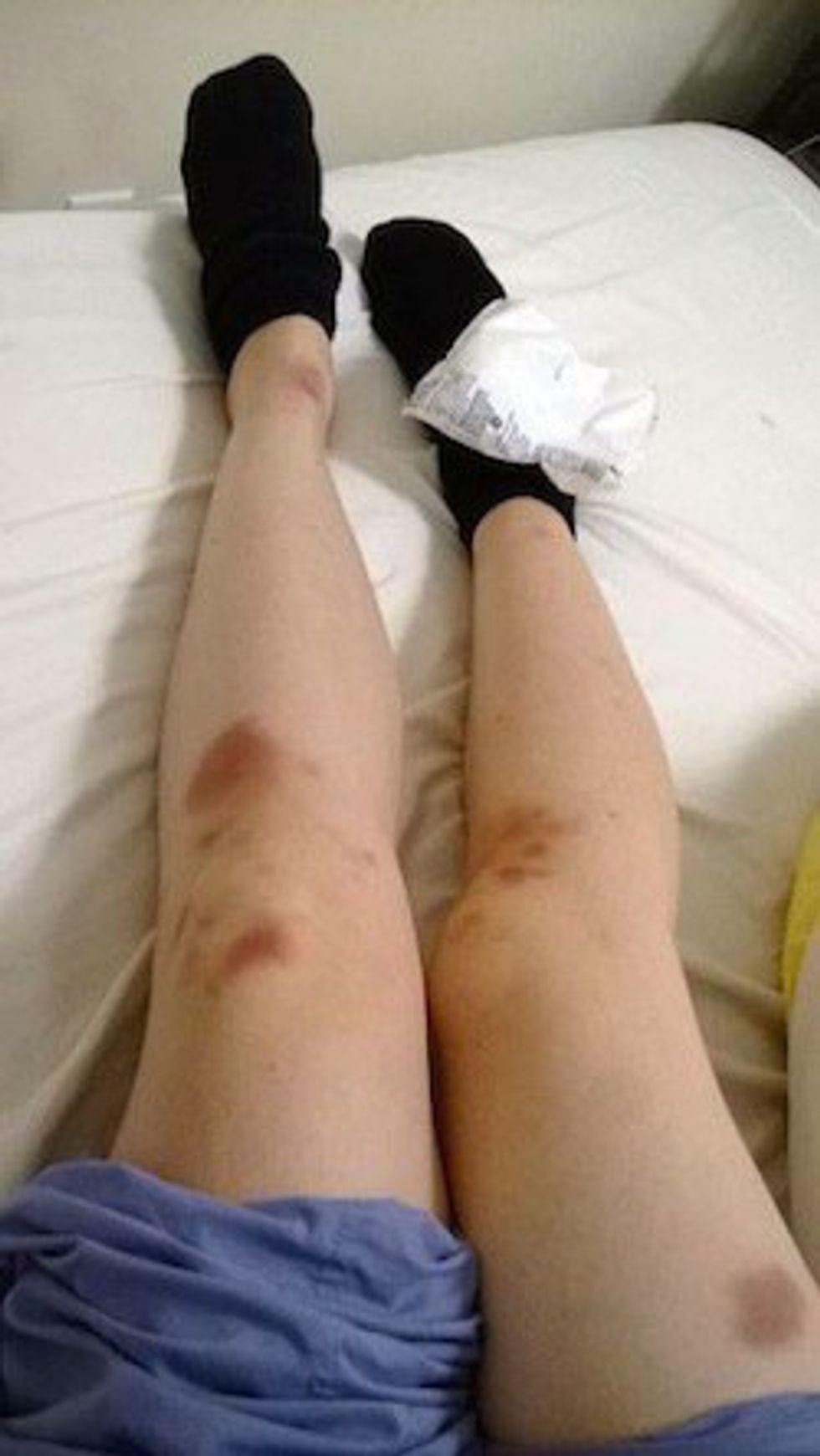Change your perspective into seeing your battle wounds as trophies or a significance of your effort and participation in class. Chances are your classmates either look the same- or worse. The teacher asked for "full-out" combinations every class and you gave it to them.