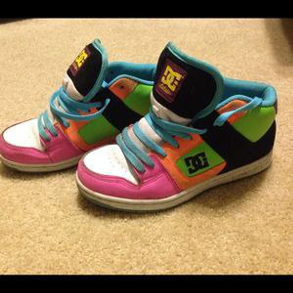 Neon skate shoes were popular for both guys and girls. And, of course, with the bar laces.