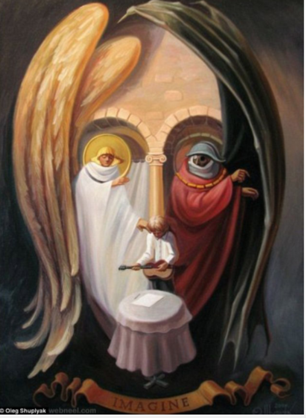 What do you see first? A damsel facing the wall or an old woman wearing a headscarf? Hint: the damsel's ear is the old woman's eye.