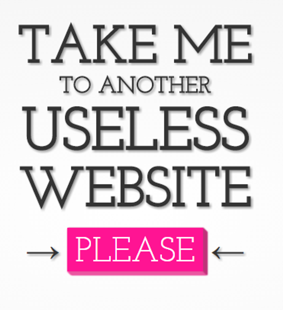 Literally one webpage. You just click the “Take Me to Another Useless Website” button and it opens a new tab that contains a completely useless website. Each site being stranger than the last and making you wonder who would actually take the time to create such a ridiculous website and why the hell you can’t stop clicking that damn button to see another one.