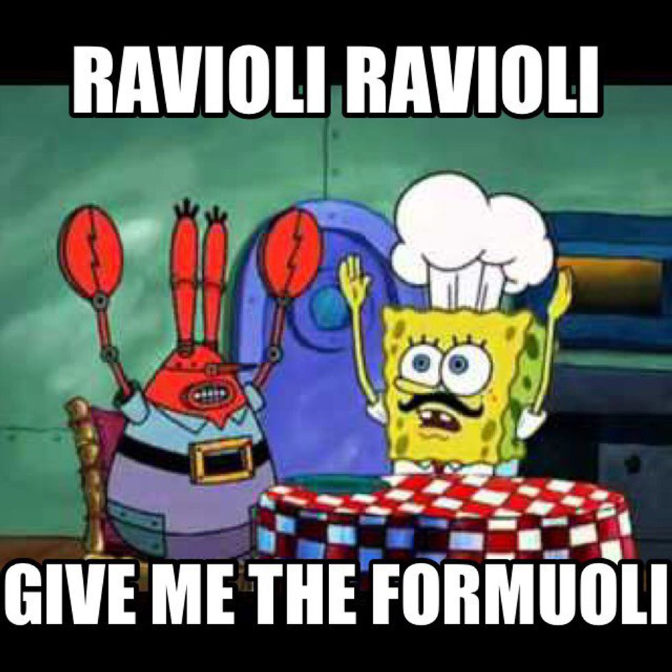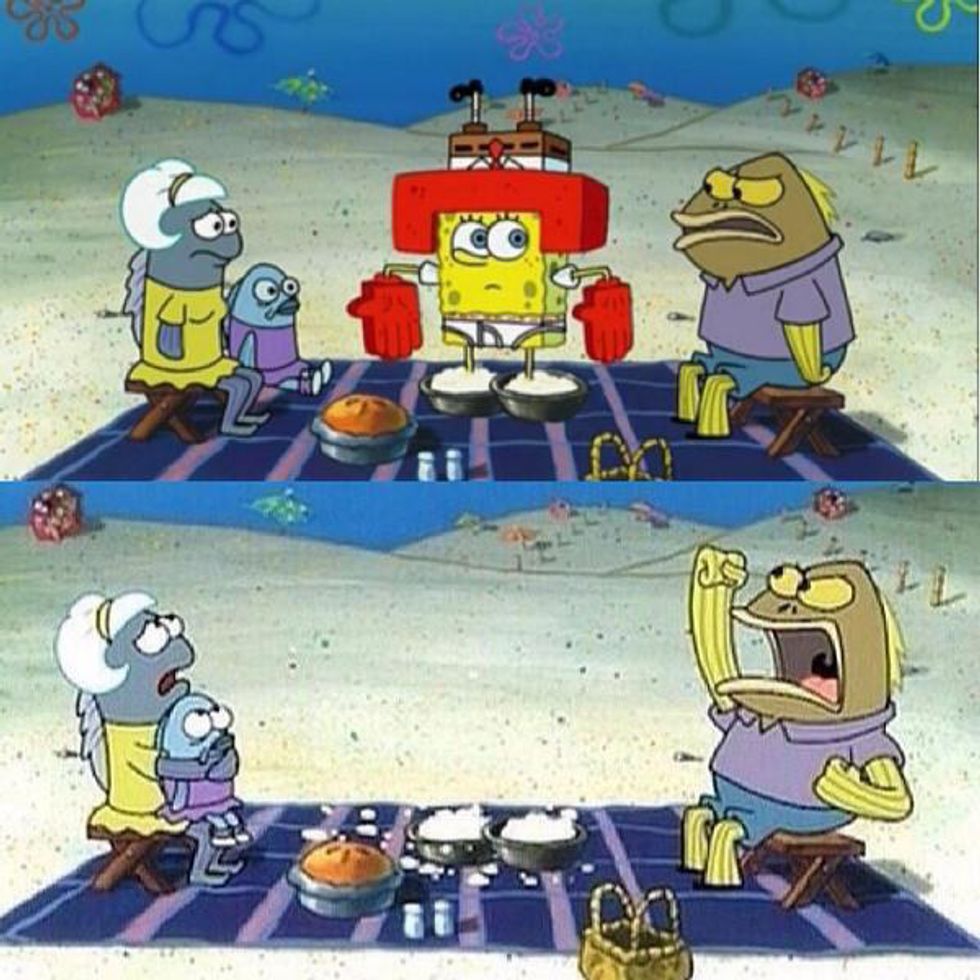 11. Spongebob and Mr. Krabs robot singing in unison: Meatball, meatball, spaghetti underneath. Ravioli, Ravioli, Great Barrier Reef!