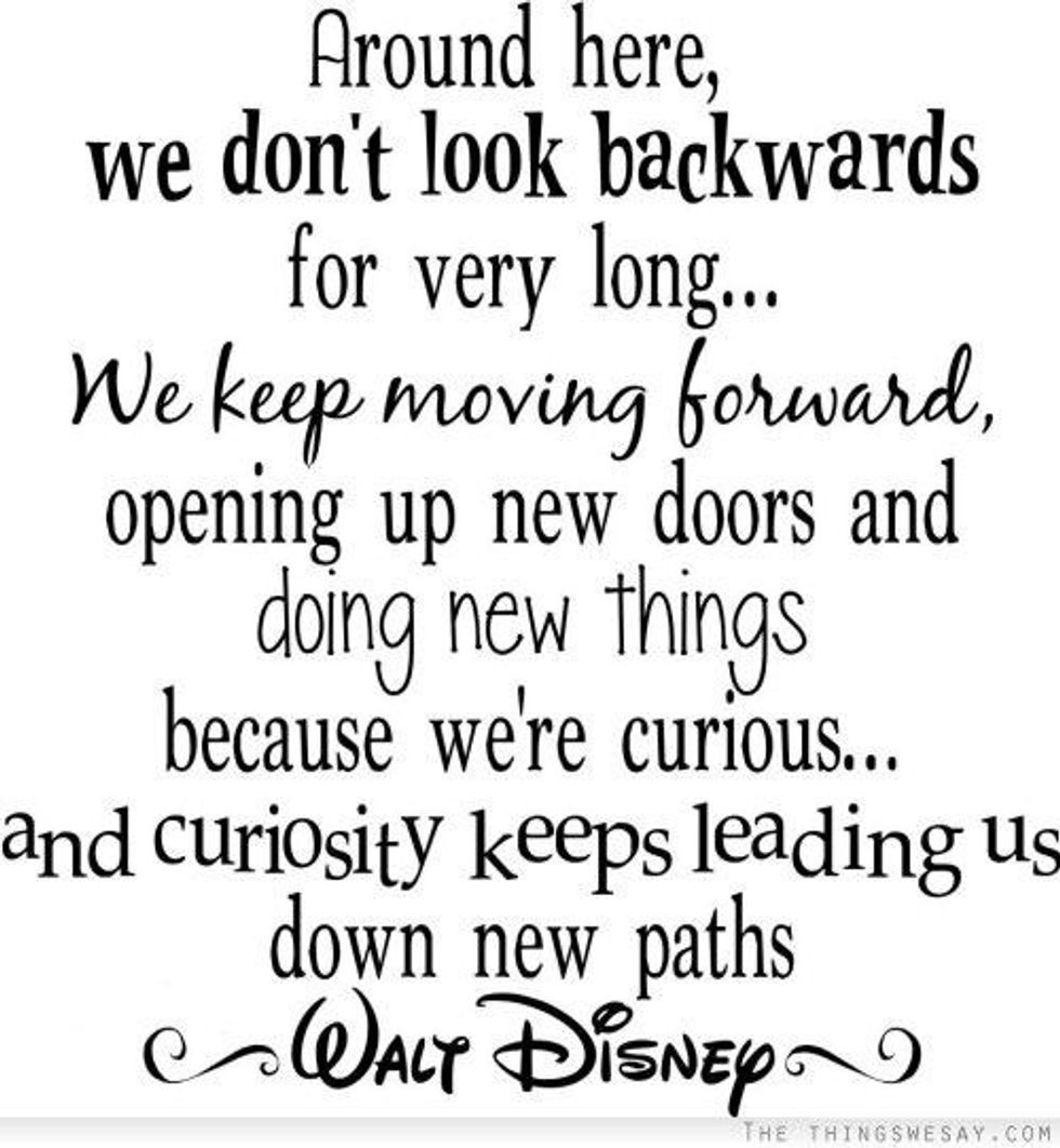 14. "Around here, we don't look backwards for very long...we keep moving forward, opening up new doors and doing new things because we're curious...and curiosity keeps leading us down new paths." -- Walt Disney