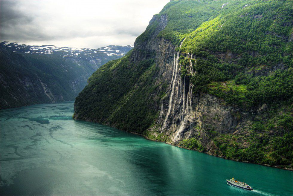 The magnificent Geiranger Fjord is home to this incredible waterfall. Norwegian folklore tells us that these seven ladies are all dancing for their suitor across the way (the single waterfall on the other side of the fjord).