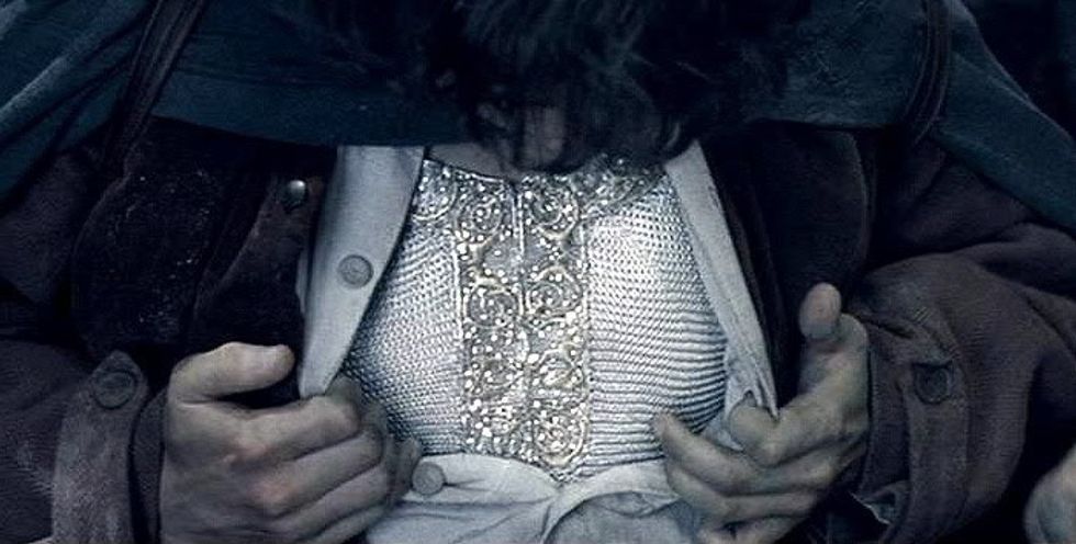 In the way of weapons, Frodo ends up in possession of a small elvish blade called Sting. It conveniently glows blue when orcs are nearby, which is super helpful if you'd like to stay away from orcs. He also has a pretty awesome piece of armor, a piece of chainmail made from a metal called mithril. It is so strong and hard that it can't be pierced by a large spear with a huge amount of force behind it (we learned this firsthand when a cave troll tried to skewer Frodo with a spear). Bonus: it's sparkly.