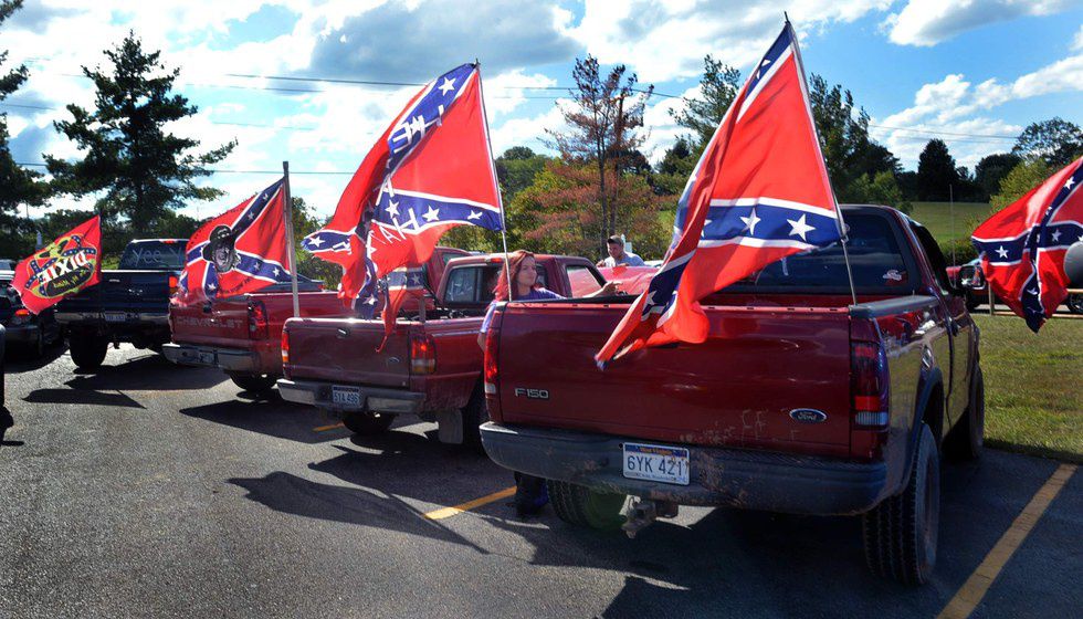I mean, you probably didn't want to see even one, but nevertheless, you will find hundreds of them at your local high school or Walmart parking lot. You can find them waving on trucks or tattooed on people's biceps. You can find them on T-shirts or on socks. You can probably order a Confederate flag cake from somewhere. They're everywhere.
