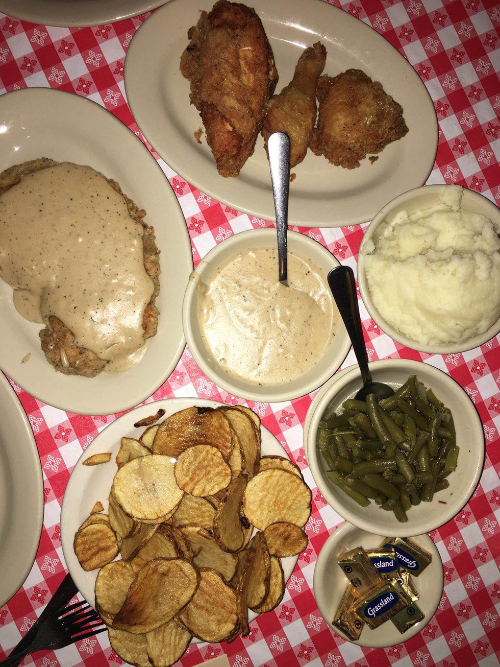 You can never go wrong with a homestyle meal at Stroud's. Pan fried chicken, mashed potatoes, gravy, potato fries, green beans, chicken noodle soup, and cinnamon rolls for dessert. What more could you ask for!?