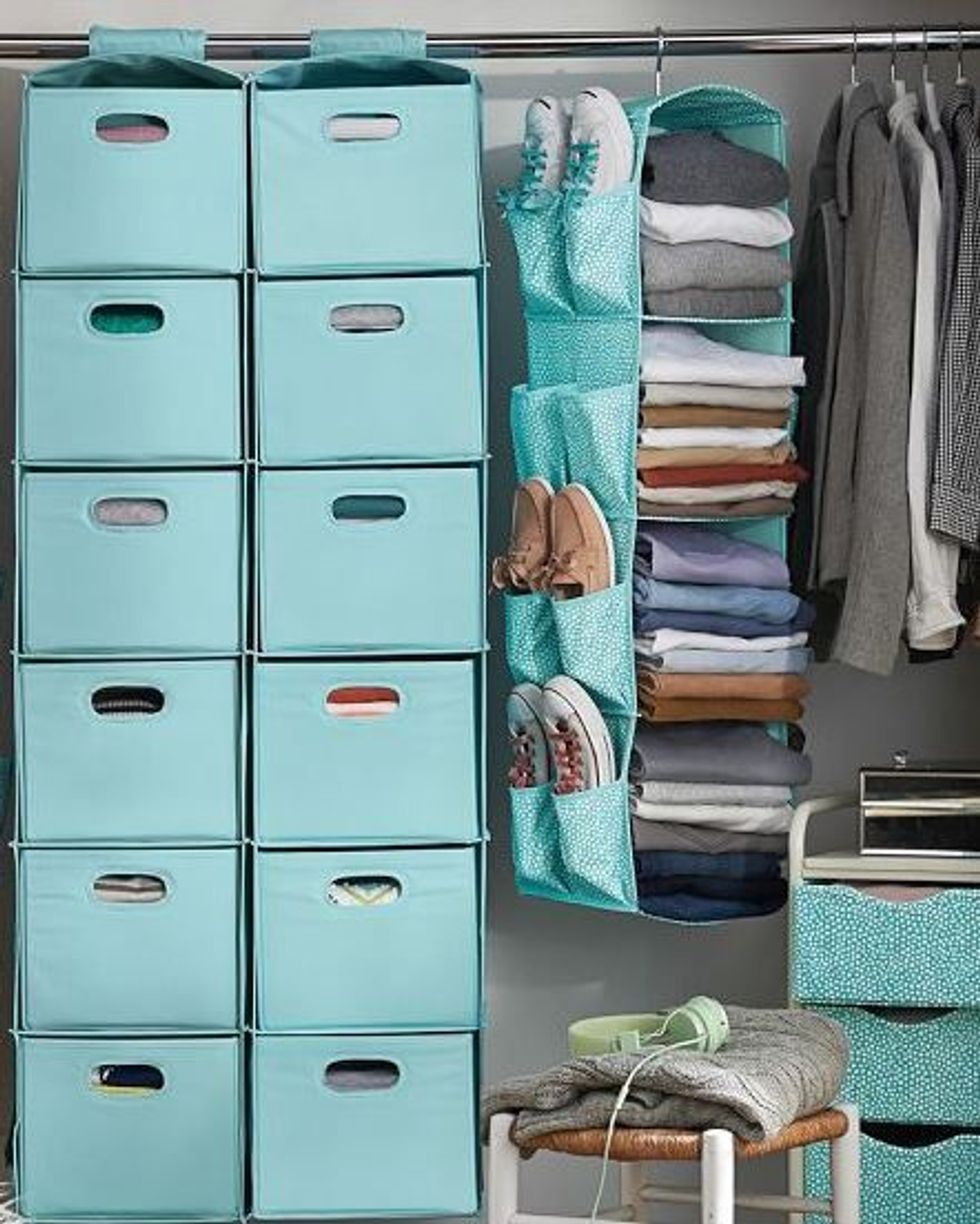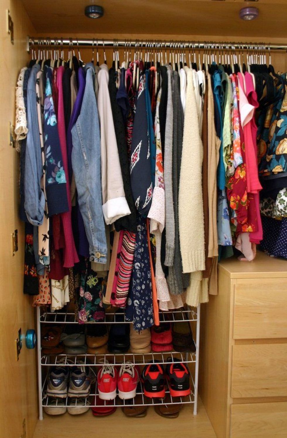 Whether it's a hanging shoe organizer or hanging shelves, closet organizers will be your holy grail. They'll free up a bunch of space and make the tiny area look a little neater.