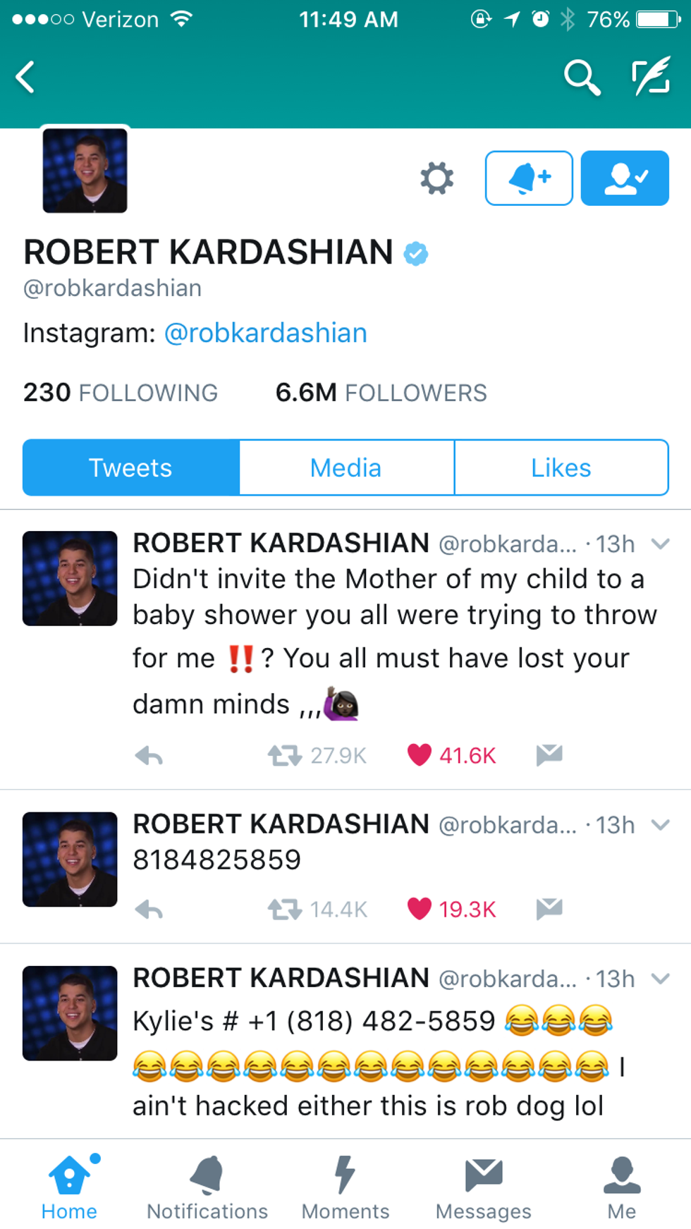 It seems as though social media was too distracted by presidential debates to notice the very direct subtweet daddy-to-be Rob Kardashian tweeted last night. This particular tweet is unlike ones we have seen from the E! Network stars as it holds the personal phone number of Kylie Jenner (No, he was not hacked. It was Rob, dog.) He tweeted her number out not once, but twice, explaining that his sisters were "out of their [darn] minds" for throwing a baby shower for him and not inviting his baby momma Blac Chyna.