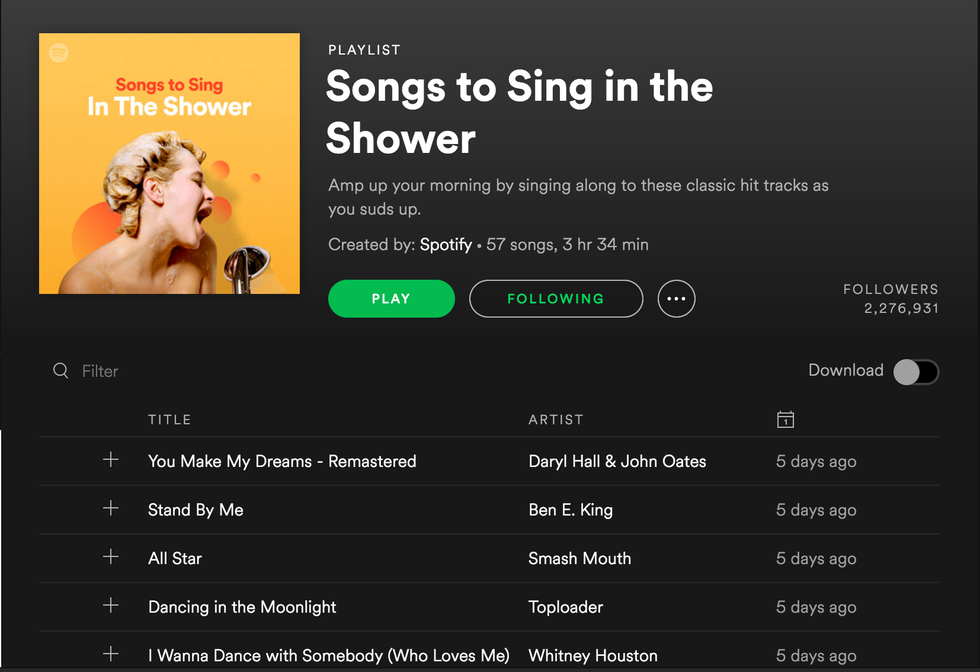 Fun and upbeat songs are great to sing and dance to, or even listen to while on your way to class. Spotify's Songs to Sing in the Shower is one of my favorites.