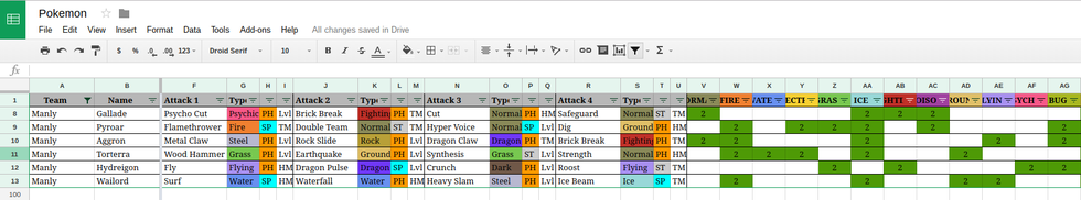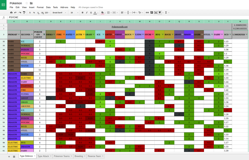 Pokemon have different types (like fire, electric, dragon, fairy, etcetera) and that results in different strengths and weaknesses to the other types. Given 18 different types of Pokemon, each of which could have one of the other 17 as a secondary type, that results in over 150 possible type combinations. I can't even begin to remember all that, so I have a spreadsheet!
